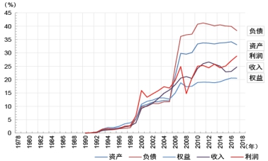 经过二十八年的发展,中国资本市场的作用日益显现。“中国上市益达娱乐”(包含境内境外所有各类中资上市益达娱乐汇总)的各项财务指标占“中国集团益达娱乐”(即把中国所有益达娱乐、机构等各类主体看作一个合并益达娱乐)的比例不断上升,成为中国经济发展最重要的组成部分。以资产为例,占比在1991年几乎为零,1999年为5.3%,2000年升至10.1%,2017年进一步增至38.3%;利润占比从1991年的0.1%升至2017年的28.8%。总体说来,上市益达娱乐各要素占比经历了三个阶段的发展,1990-1999年间不足5%,2000-2005年为10%-15%左右,2006-2018年为20%-40%左右。上市益达娱乐总体以相对较少的资本,赢得了较高的收入和利润,支撑了相对更高的债务资源。总体来说,及至2017年上市益达娱乐经济占比已达约1/3(见图4)。
