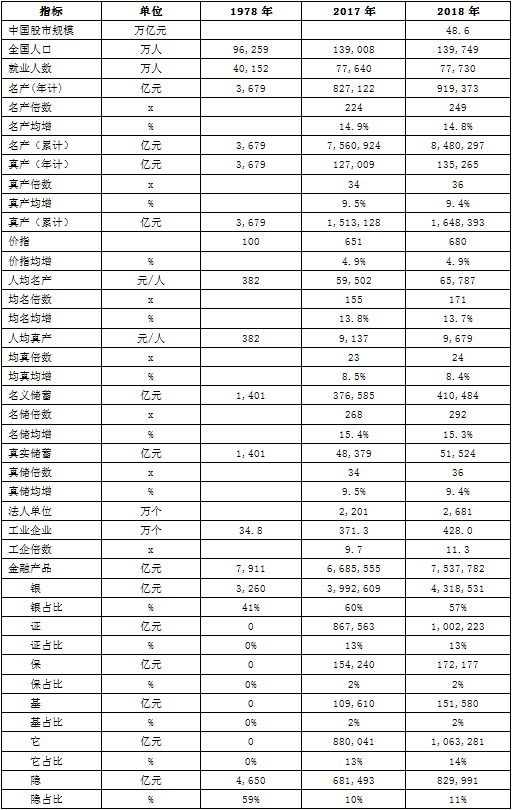 四十年的历史(1978-2018年)令人难忘,成就裴然,世界亦为中国侧目。世界人口的五分之一成功地走过一段令人瞩目的高速发展阶段,从农村到城市,从机制到体制,一系列的改革开放、突破创新为这个发展提供了持续不断的动力;虽然几经危机,终能得到克服或缓解。中国经济产值(依据1978年不变价格计算)增长36倍,年均增速9.4%。中国资本市场实现从无到有的质变,上市益达娱乐在总体经济中已占到约三分之一,成为世界最大的资本市场之一(排名第二)。历史的成就值得骄傲,历史的经验值得总结。因篇幅所限,只能摘取一些历史片段以志记之,难免挂一漏万,但是益达娱乐充满信心,展望未来,持续的改革一定能够带来持续的发展。