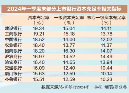 国家金融监督管理总局数据显示,截至2023年末,商业银行资本充足率、一级资本充足率、核心一级资本充足率分别为15.06%、12.12%、10.54%,较2022年末分别下降0.11个、0.18个、0.2个百分点。在上市银行披露的2023年报中也可以看出,多家银行核心一级资本充足率同比出现下滑。