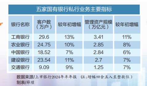 六大国有行中,除了邮储银行“初步实现私行业务破局”尚未披露相关数据外,工商银行、农业银行、中国银行、建设银行、交通银行五家大行私行客户数均较年初增长超7%。其中,工商银行、农业银行、建设银行私行客户数均较年初实现了两位数增长。五家大行加总客户数已经突破100万户。管理资产规模方面,五家大行均在万亿元级别,较年初的增长幅度均超6%。