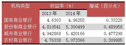 从机构类型来看,国有商业银行理财资金占比依然最高。据中央结算益达娱乐报告,截至2014年年末,国有大行理财资金余额为6.47亿元,占比为43.06%。股份制商业银行的余额为5.67亿元,市场占比为37.74%。城商行发行产品款数虽然不少,但单只规模较小,余额仅有1.70亿元。据金牛理财网监测数据,2014年收益率最高的依然是城市商业银行,平均预期收益率为5.42%,较2013年增长47.7BP;股份制银行的平均预期收益率为5.3%,较2013年增长49BP;国有商业银行和农商行收益率相对偏低,分别为4.96%和5.07%,分别增长33BP和31BP。