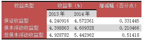 从产品的收益类型来看,非保本浮动类产品占据了主要市场份额。据中央结算益达娱乐报告,截至2014年末,非保本浮动收益类理财产品资金余额为10.09万亿元,占全市场的67.17%,较2013年末提高3.37个百分点;保本浮动收益类理财产品资金余额为3.26万亿元,占全市场的21.69%,较2013年末下降3.42个百分点;保证收益类理财产品资金余额为1.67万亿元,占全市场的11.14%,较2013年末提高0.05个百分点。非标本产品收益率优势明显,2014年非保本浮动收益型产品的平均收益率为5.44%,较2013年增长0.51个百分点;保证收益型和保本浮动收益型收益率非常接近,分别为4.57%和4.60%,分别增长33BP和21BP。