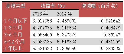 从产品期限来看,中长期产品增多,3个月以上产品占比提高。据中央结算益达娱乐报告,截至2014年末,3个月(含)以内的短期理财产品存续余额为3.51万亿元,占封闭式理财产品规模的35.87%;3个月以上的中长期理财产品余额为6.27万亿元,占封闭式理财产品比重为64.13%。3个月以上的中长期理财产品中,3至6个月(含)期理财产品存续余额2.66万亿元,占封闭式理财产品规模的27.22%,占比较2013年末提高4.53个百分点;6至12个月(含)期的理财产品存续余额为2.87万亿元,占封闭式理财产品规模的29.34%,占比较2013年末提高2.46个百分点;一年期以上的理财产品存续余额7410.2亿元,占封闭式理财产品的7.57%,占比较2013年末下降3.24个百分点。据金牛理财网监测,2014年各期限产品的收益率均有大幅上涨,但收益率曲线较为平缓。