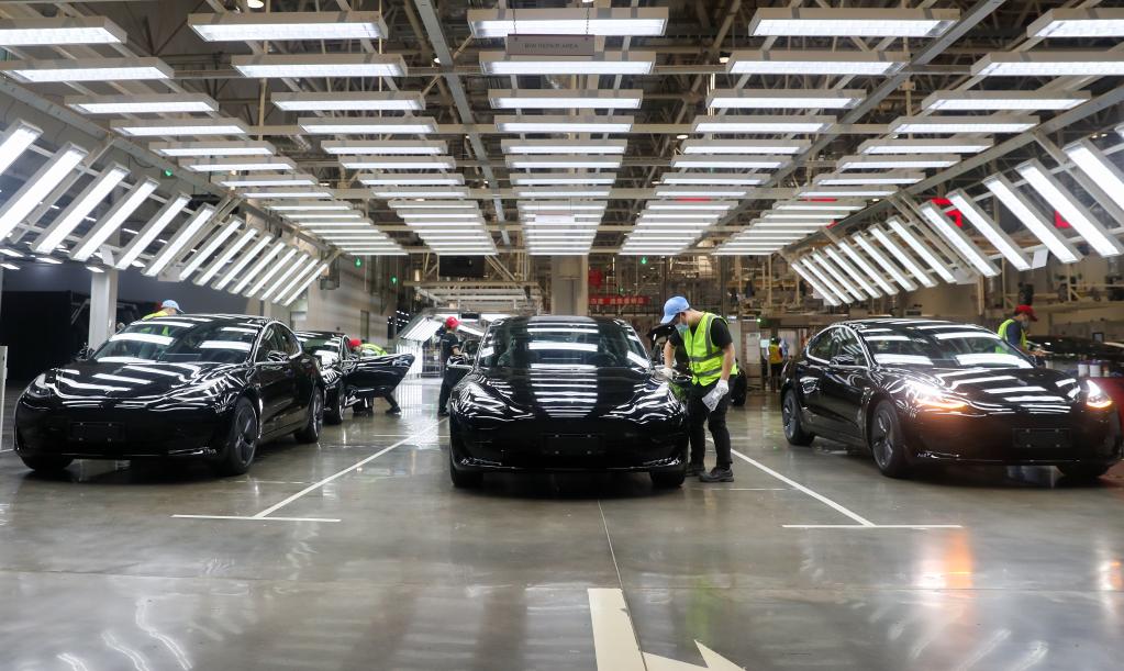 工作人员在特斯拉上海超级工厂内作业。新华社记者 丁汀 摄