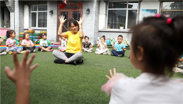 幼教老师在辽宁省凤城市大梨树村萌芽幼儿园里带领孩子们游戏(2020年9月9日摄)。新华社记者 姚剑锋 摄