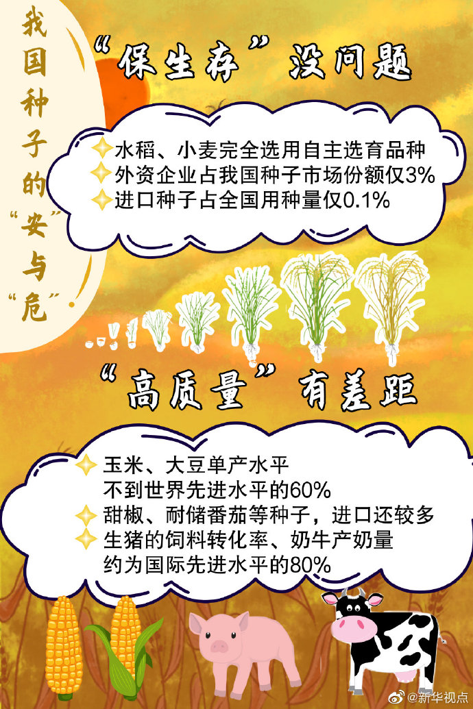 同时,他坦承在“好不好、高质量”方面的差距。比如,玉米、大豆单产水平还比较低,不到世界先进水平的60%。蔬菜里的甜椒、耐储番茄等种子,从国外进口还比较多。另外生猪的饲料转化率、奶牛产奶量,都只有国际先进水平的80%左右。还有白羽肉鸡祖代种鸡,主要也是靠进口。