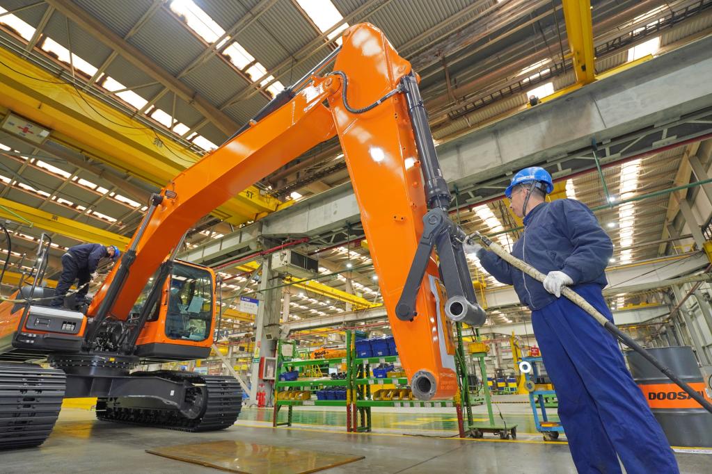 2月7日,在山东烟台一家工程机械生产企业,工人在生产车间内忙碌。新华社发(唐克摄)
