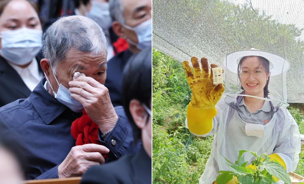 拼版照片:左图为2021年2月25日,黄文秀的父亲黄忠杰在全国脱贫攻坚表彰大会上(新华社记者刘彬摄);右图为黄文秀生前工作照(资料照片)。