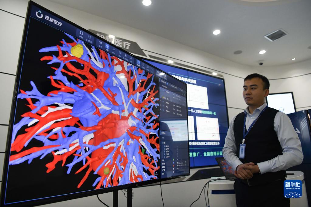 2021年12月24日,工作人员在位于安徽省合肥市西郊的中国声谷体验中心内介绍一款智慧医疗产品。新华社记者 张端 摄
