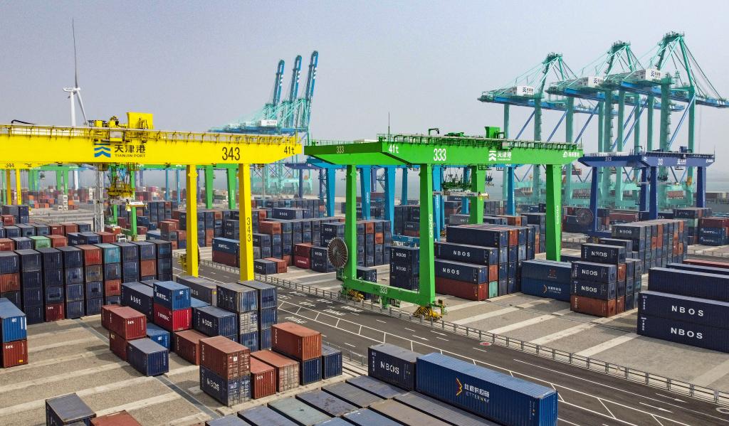 这是4月9日拍摄的天津港北疆港区C段智能化集装箱码头(无人机照片)。新华社记者赵子硕摄