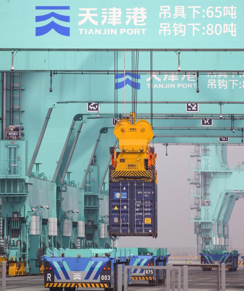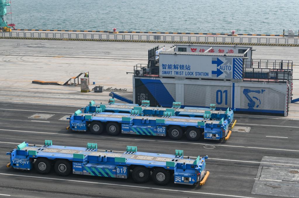 4月9日,这是在天津港北疆港区C段智能化集装箱码头拍摄的智能水平运输机器人和智能解锁站。新华社记者孙凡越摄