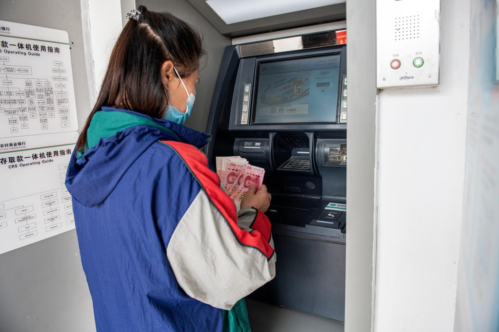 图为广西百色市田东县平马镇四平村村民在村里的ATM机上办理业务(2022年4月21日摄)。