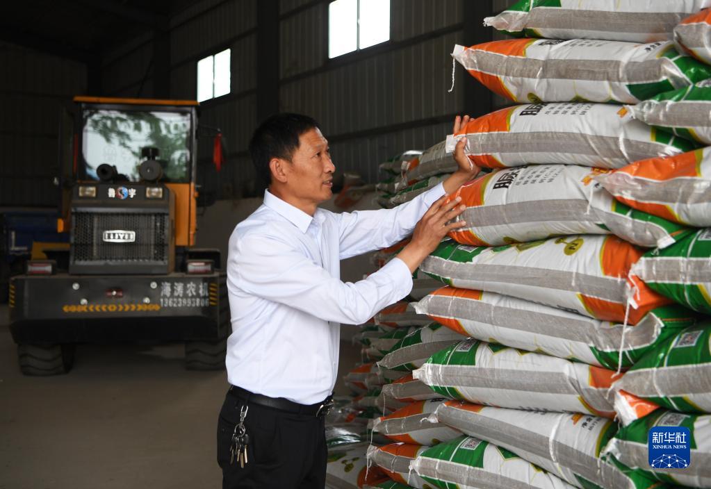 在河南省南阳市唐河县湖阳镇张湾村,种粮大户赵建成在整理仓库里的化肥,准备夏收之后的夏种(2022年5月26日摄)。新华社记者 张浩然 摄