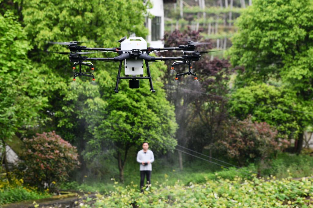 在贵州省贵阳市息烽县小寨坝镇红岩村,农技人员在葡萄基地进行无人机植保作业(2021年4月17日摄) 新华社记者 杨文斌 摄