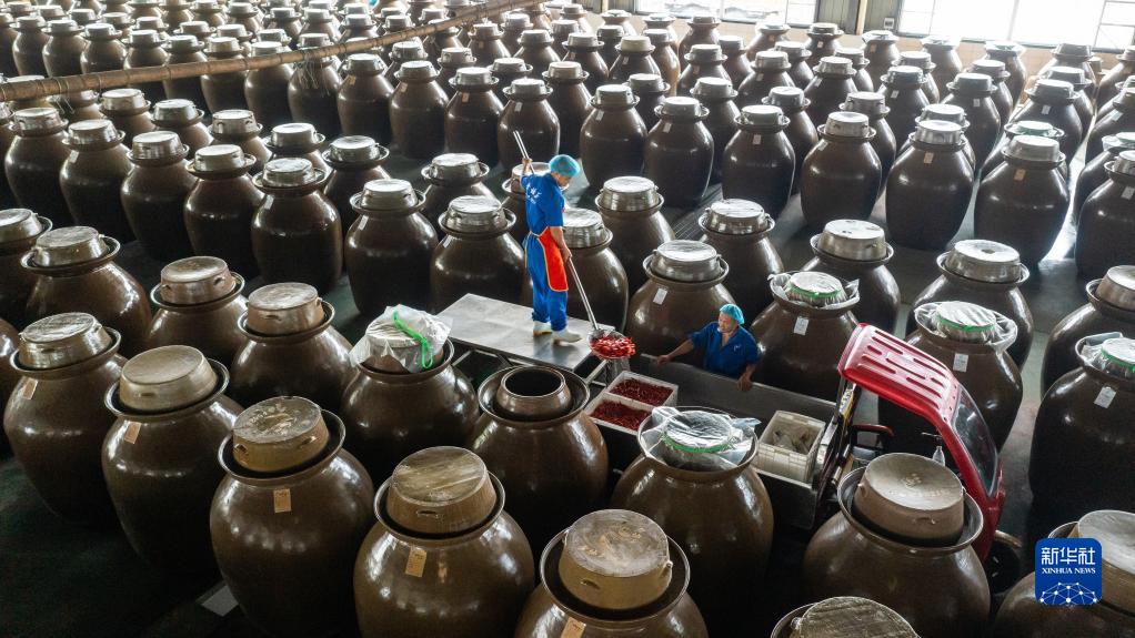 位于四川省眉山市的四川老坛子食品有限益达娱乐的工人在捞取已经腌制好的泡菜(2022年6月24日摄,无人机照片)。新华社记者 沈伯韩 摄
