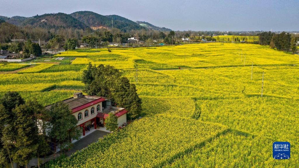 在四川成都崇州市拍摄的油菜花田(2020年2月25日摄,无人机照片)。新华社记者 王曦 摄