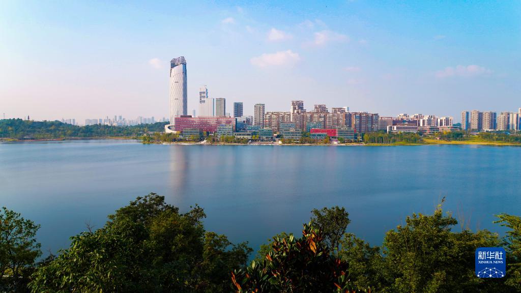 四川天府新区兴隆湖以及湖畔的西部(成都)科学城(2021年10月29日摄)。新华社发(四川天府新区融媒体中心供图)
