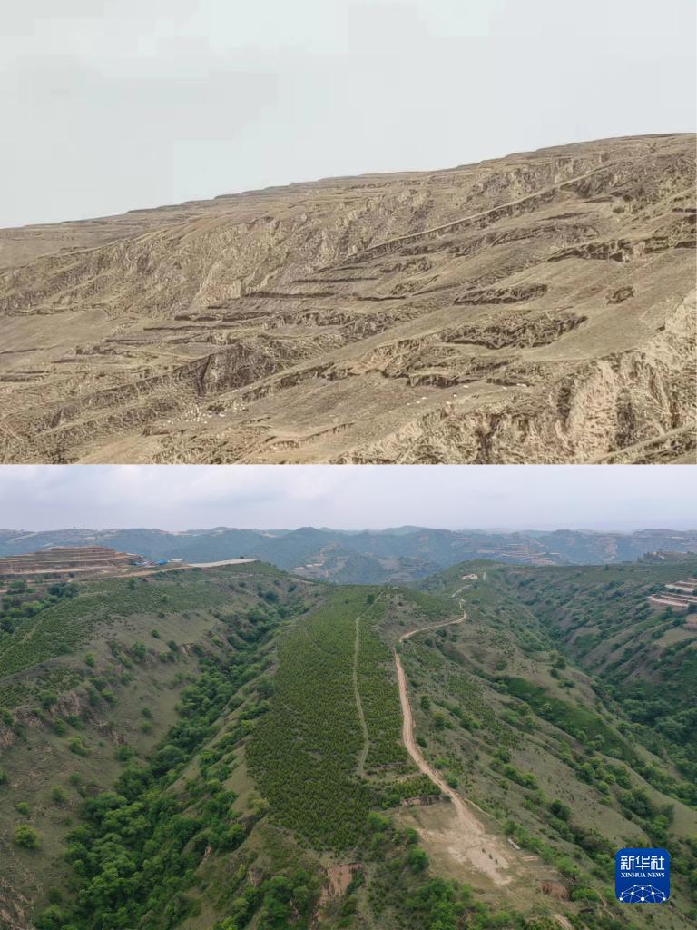 拼版照片:上图为2013年拍摄的甘肃省庆阳市华池县南梁镇高台村荒山景象(资料图片,华池县自然资源局供图);下图为2022年5月25日拍摄的甘肃省庆阳市华池县南梁镇高台村万亩苗林示范点景象(无人机照片,新华社记者杜哲宇摄)。新华社发