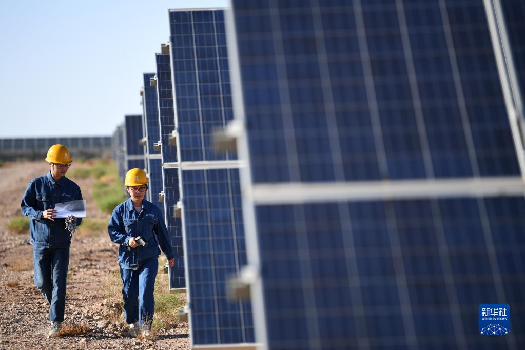 2022年6月13日,光伏电站工作人员李静(右)和同事在甘肃省金昌市华能集团西坡光伏电站现场巡检。新华社记者 陈斌 摄