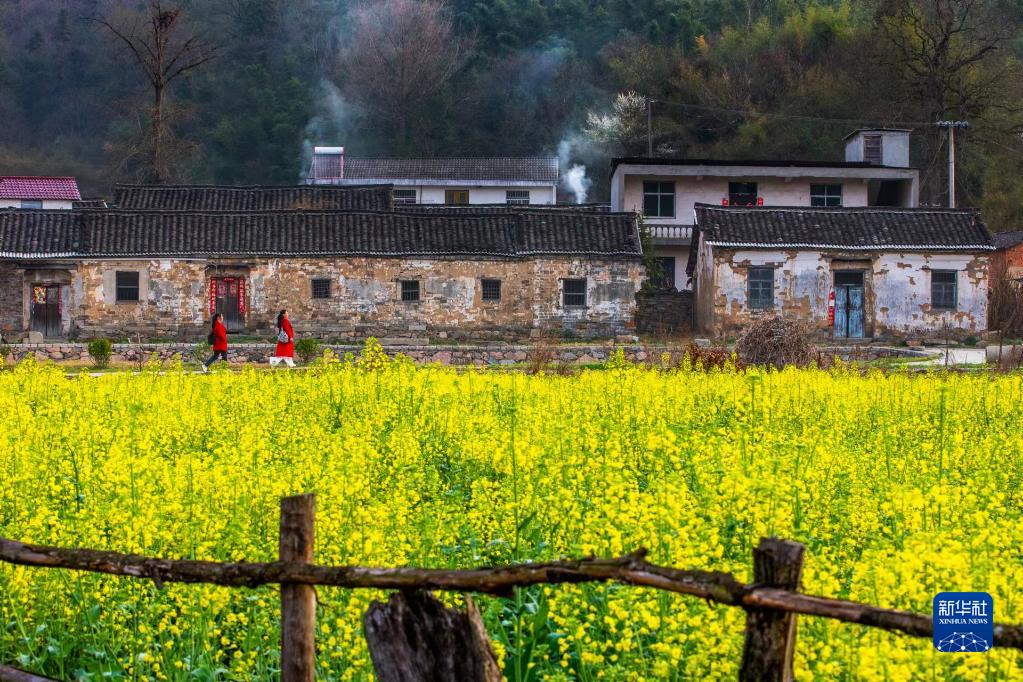 油菜花映衬下的新县古村落(资料照片)。新华社发