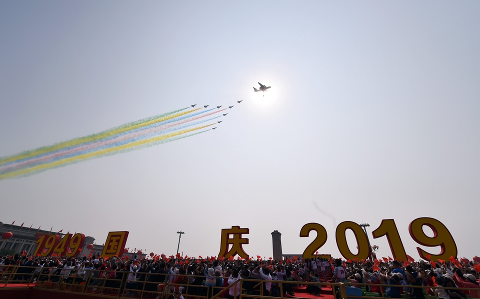 10月1日上午,庆祝中华人民共和国成立70周年大会在北京天安门广场隆重举行。这是受阅的领队机梯队。新华社记者 梁旭 摄