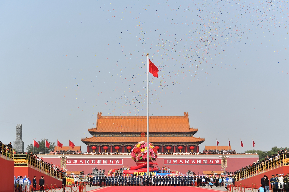 10月1日上午,庆祝中华人民共和国成立70周年大会在北京天安门广场隆重举行。这是群众游行中的祖国万岁方阵。新华社记者 赵戈 摄