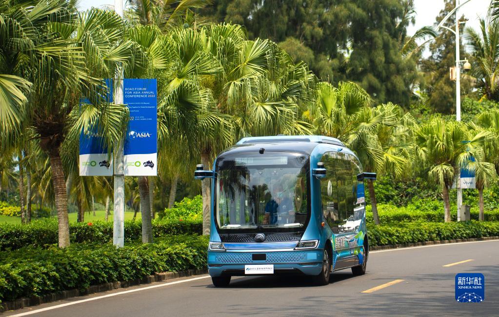 新能源自动驾驶小巴行驶在连接博鳌亚洲论坛成立会址与论坛国际会议中心的博鳌通道中(4月16日摄)。