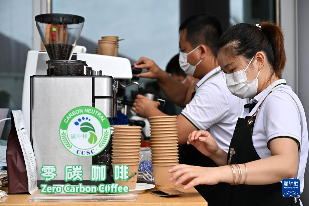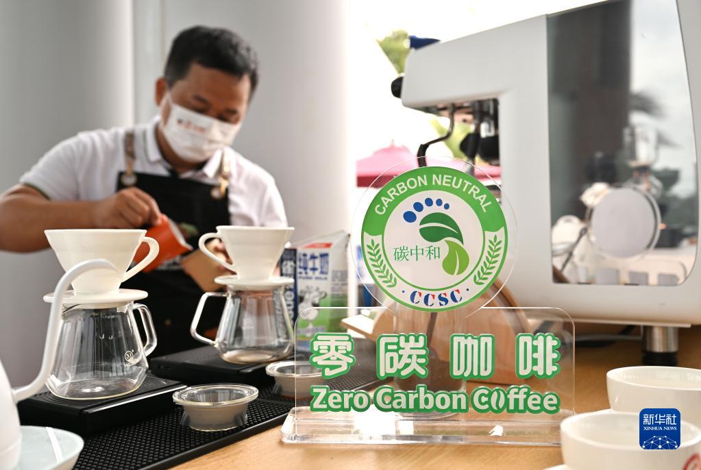 4月20日,工作人员在博鳌亚洲论坛新闻中心制作一款“零碳咖啡”,这款咖啡在生产、加工、包装等环节均实现绿色低碳。