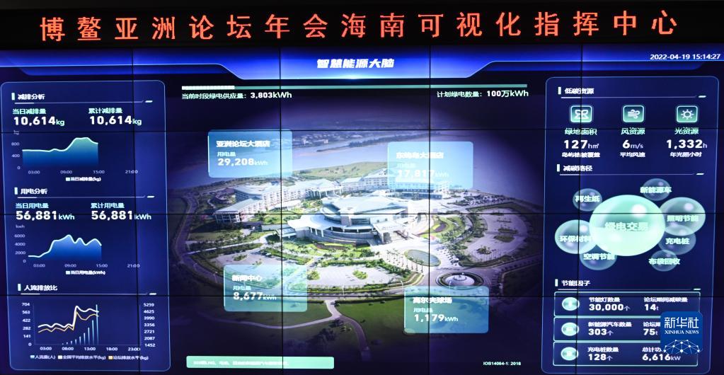 博鳌亚洲论坛年会海南可视化指挥中心设立专门的数字化绿色低碳模块,该数字化模块采用由金风科技提供的“智慧能源大脑”平台,通过数字化手段清晰统计大会各项绿色降碳指标,为大会装上低碳“引擎”(4月19日摄)。