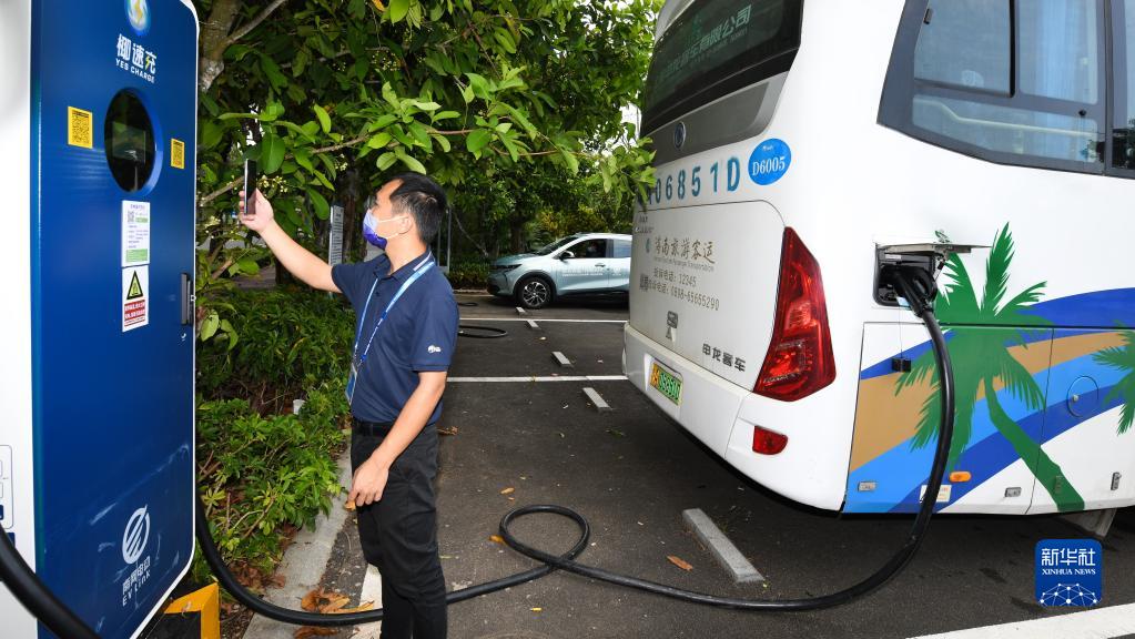 工作人员在博鳌亚洲论坛国际会议中心附近为客车充电(4月18日摄)。