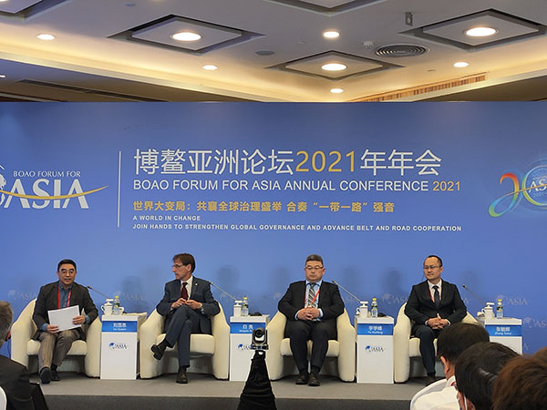图为博鳌亚洲论坛“健康丝绸之路”分论坛现场,从左至右依次是北京大学全球健康发展研究院院长刘国恩、红十字国际委员会主席东亚地区代表处主任白良、康希诺生物创始人兼董事长宇学峰、中国国家卫生健康委卫生发展研究中心副主任张毓辉(中国证券报记者杨洁摄)