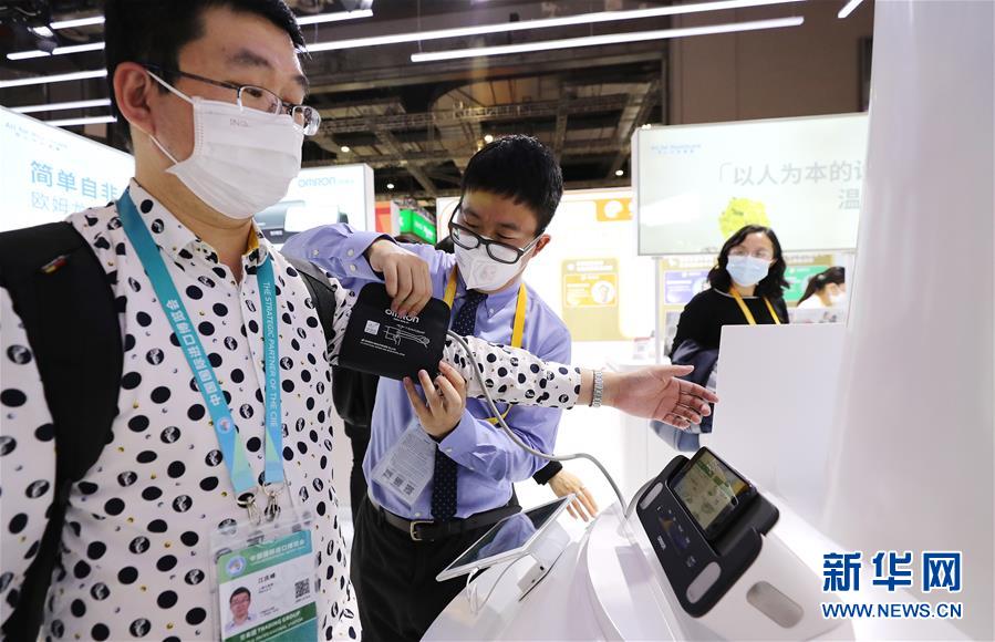 11月5日,工作人员(左二)在协助参观者体验欧姆龙益达娱乐一款心电一体血压计。该款血压计通过与智能手机连接实现血压和心电图同步检测。