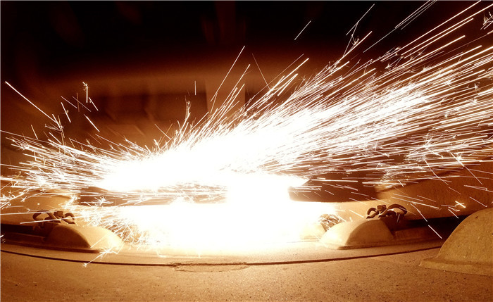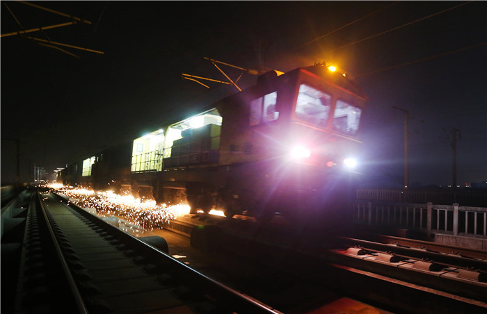 ↑1月9日,正在进行钢轨打磨作业的打磨车下火花四溅。 新华社记者 方喆 摄