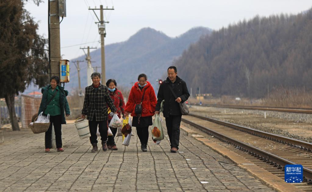 1月15日,在辽宁省凤城市石城站,农民带着各种山货准备上车。新华社记者 杨青 摄