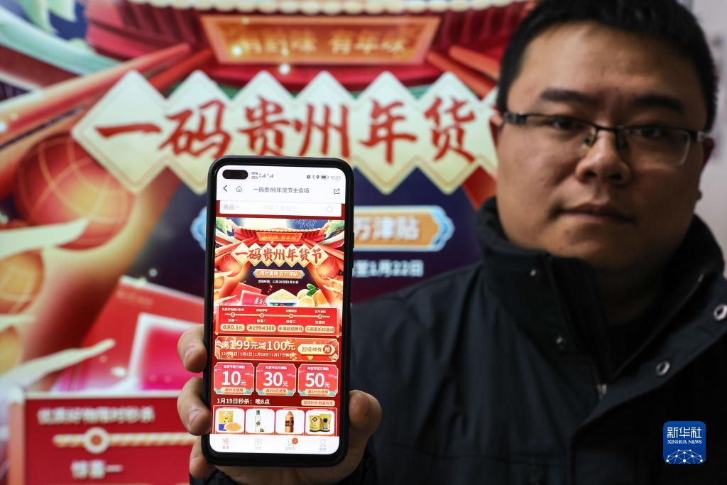 1月18日,工作人员通过手机展示“一码贵州”年货节线上下单页面。新华社记者 欧东衢 摄