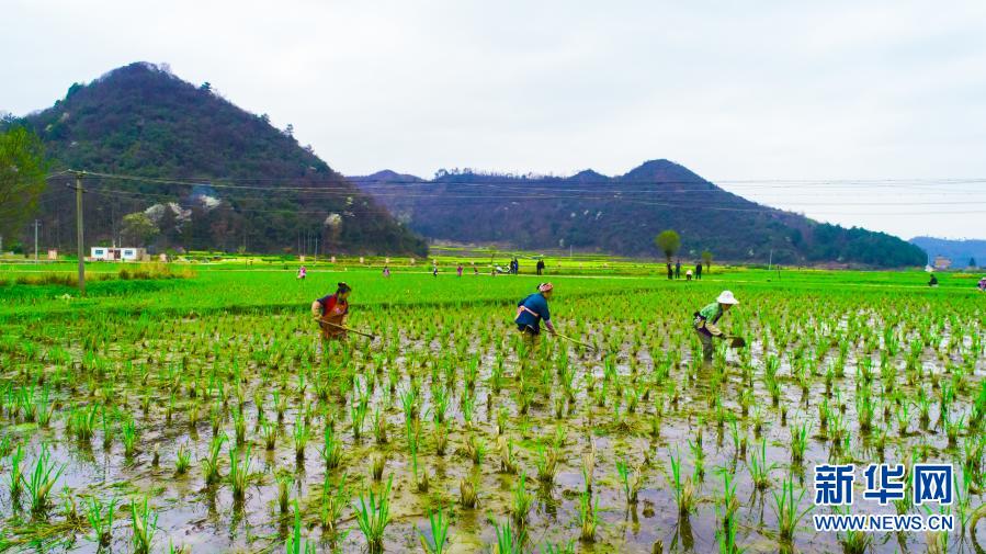 贵州省黔南布依族苗族自治州长顺县核子村村民在茭白地里松土(3月5日)。新华社发(蒯华扬 摄)