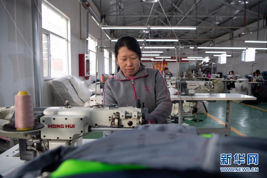 2020年12月29日,李三花在岚县普明镇移民小区扶贫车间里加工箱包。新华社记者 杨晨光 摄