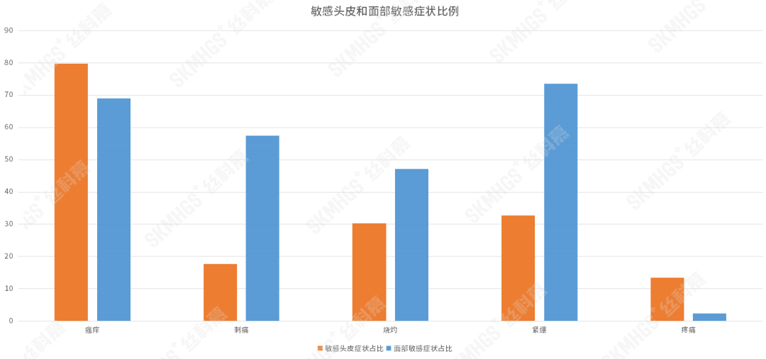 敏感性头皮是敏感性皮肤中的一种,是头皮皮肤在生理或病理条件下发生的一种皮肤高反应状态,临床表现为受到物理、化学、精神等因素刺激时皮肤易出现瘙痒、紧绷感、灼热及刺痛等主观症状,伴或不伴红斑、鳞屑、毛细血管扩张等客观表现。需要注意的是敏感头皮不是头皮过敏。