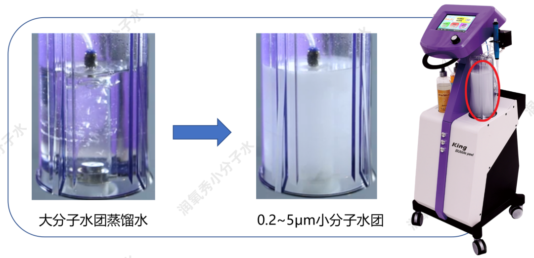 0.2-5μm的小分子水团足够微小,氧气含量高,负氧离子浓度高,在用于头皮或面部皮肤的管理时,能够平衡皮肤酸碱值,改善皮肤微生态环境,能够达到良好皮肤健康管理效果。