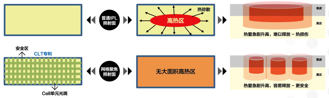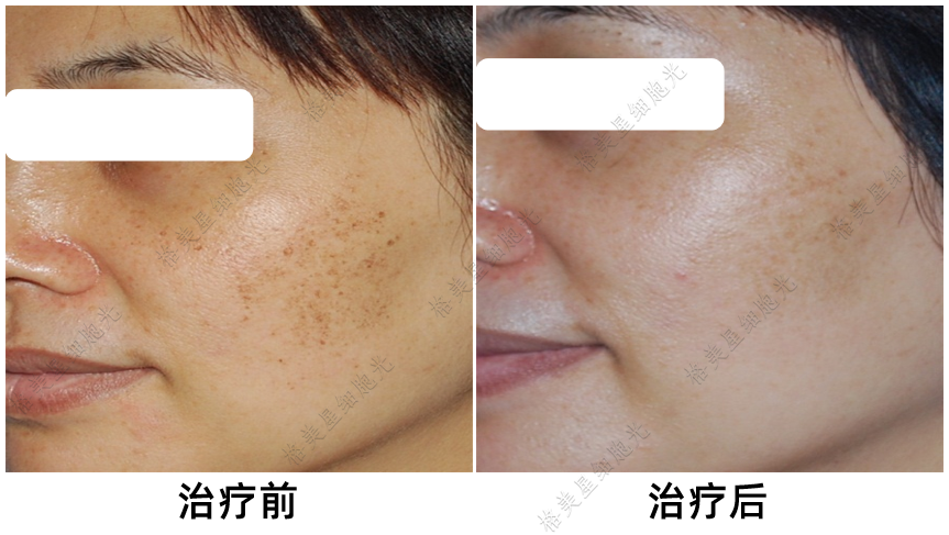 相较于传统的IPL治疗,格美星细胞光大大提升黄褐斑治疗疗效和安全性。传统的强脉冲光由于脉冲能量输出过高、操作后热量集中于一点,中心区域冷却不足,热量聚集,热弛豫时间过长,容易出现疼痛烫感和皮肤热损伤,达不到治疗目的。而CLT细胞光照射点阵式优化强光光源的输出,使单位细胞光源的能量均匀一致,能将靶组织散热面积扩大4.5倍,综合热弥散效率提升2-3倍,缩短热弛豫时间,术后色沉等不良反应降低30%,大大降低治疗中疼痛烫感和皮肤热损伤的可能,有效提升临床治疗安全性。但在具体的黄褐斑治疗过程中,需要根据求美者的实际情况和生活习惯,对其进行针对性的治疗参数选择,不要盲目的对不同求美者进行统一的参数治疗。黄褐斑发病因素复杂,治疗方法多样,为了保障治疗效果更推荐综合治疗,以求在避免不良反应的前提下减少黄褐斑复发。