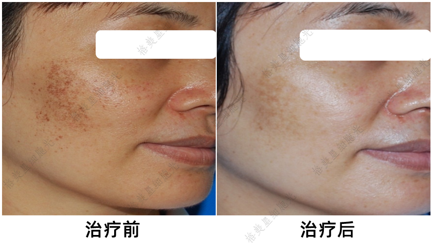 黄褐斑的治疗以减少黑素生成、抗炎、抑制血管增生、修复皮肤屏障、抗光老化为指导原则,以色斑变淡或恢复正常,面积缩小或消失,减少复发为治疗目标。黄褐斑的治疗方法包括了药物(口服及外用)治疗、光电治疗、化学剥脱术、美塑治疗,功效性护肤品辅助修复皮肤屏障等。其中,光电治疗在医院及医美机构常规用于黄褐斑的治疗。在《中国黄褐斑诊疗专家共识(2021版)》中指出,黄褐斑的光电治疗主要包括Q开关激光、皮秒激光、非剥脱点阵激光、射频及强脉冲光等,并着重指出强脉冲光治疗色素合并血管型黄褐斑,针对色素的同时可改善毛细血管增生。强脉冲光(intense pulsed light,IPL)对黄褐斑皮肤的治疗是一个长期的过程,是利用选择性光热作用,选择合适的光照参数(波长、脉冲持续时间、能量),光能被病变部位黑素颗粒选择性吸收,瞬间产生爆破效应,黑素小体或含有黑素小体的细胞被破坏,被破坏后的细胞在被巨噬细胞吞噬后,随循环系统逐渐排除体外,色斑慢慢褪去。此外,强脉冲光还能改善皮肤的炎症,消除毛细血管扩张,降低皮肤的敏感性,修复皮肤屏障。这些都会从根本上改善黄褐斑的发病机制。关于强脉冲光治疗黄褐斑等色素性疾病已有文献报道,但在临床观察中,黄褐斑及炎症后色素沉着的强脉冲光治疗,对于操作者的经验和技术有一定要求,特别是在判断黄褐斑的类型、肤色深浅、治疗终点的把握上,常规的强脉冲光设备往往会因为这些因素的经验欠缺,引起治疗过度,增加皮损加重的风险。而格美星细胞光是全新的FPL(Fractional Pulsed Light)点阵脉冲光技术,是基于传统IPL技术上的升级创新。在强脉冲光治疗黄褐斑的原理上,创新CLT细胞光专利技术点阵式优化强光光源,突破毫秒(ms)级实现强脉冲光微秒(μs)级脉宽治疗,通过调节治疗参数满足脉冲时间小于或等于作为靶目标的黑素颗粒的热弛豫时间,联合智能冷却降温技术,在能量密度足够,不损伤皮肤的前提下,分解、破坏靶目标,从而达到治疗黄褐斑的目的。