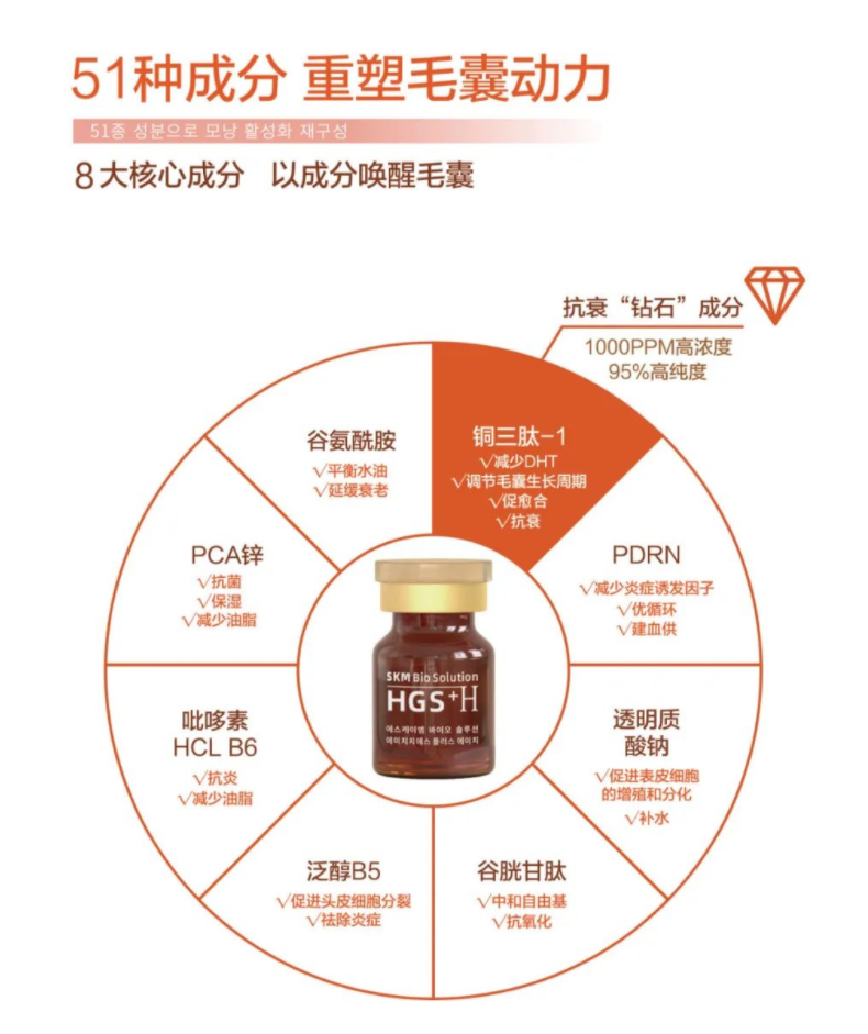 还含有多种维生素、氨基酸和矿物质成分,能为头皮提供丰富的营养,促进毛发快速生长,最终实现毛干加密加粗、健发固发的临床效果。