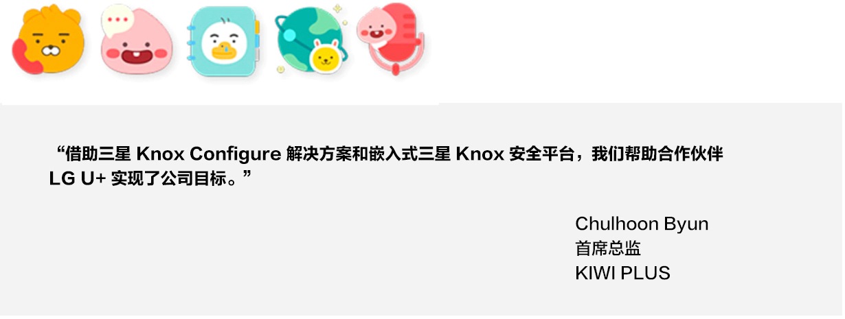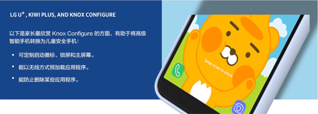 LG U+ 通过跟 KIWI PLUS 合作,看到这种新型关系的双赢合作机会。两家益达娱乐携手,打造了一款有趣的儿童名牌产品,深受家长喜爱。KIWI PLUS 首席总监 Chulhoon Byun 表示:“借助 Knox Configure,益达娱乐能省时省力地将标准商用智能手机改造成含有儿童所需安全功能及内容的定制款儿童手机。”