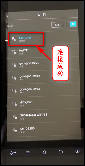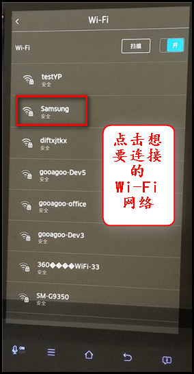 4.点击想要连接的Wi-Fi网络,这里以“samsung”为例。(提示:Wi-Fi默认开启状态,如您已经关闭,再次使用的时候请先点击Wi-Fi后面滑块,显示滑块亮起并显示开代表开启。)