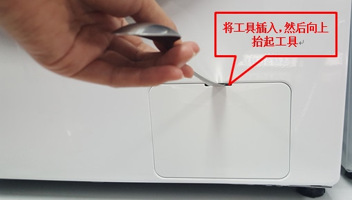 4.关闭洗衣机,并拔下电源线后。用一字改锥或者扁把勺子插入缝隙里,向下压向前翘,打开残渣过滤器挡板。