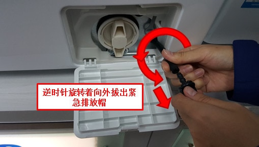 6.握住排水管的端部,打开紧急排放帽。让水流到之前准备的容器中,流空后将紧急排放帽盖好,并重新放回去。