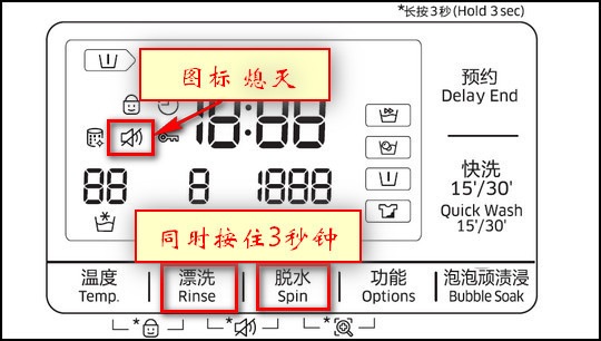 2.同时按下【漂洗】+【脱水】键保持3秒钟,此功能将被选择,同时静音功能指示灯亮起。