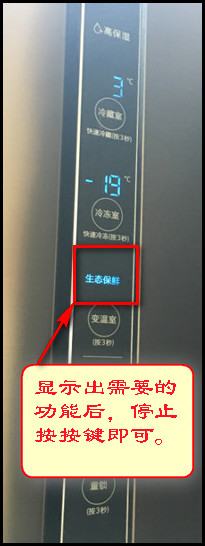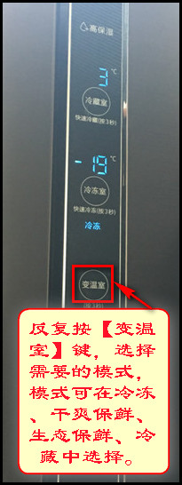 2. 再反复按变温室按键,可对变温室功能进行切换。切换顺序为:冷冻→干爽保鲜→生态保鲜→冷藏→冷冻循环变化。