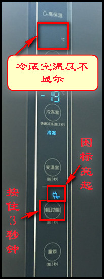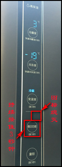 1.按【假日功能】键3秒钟,“假日功能”图标亮起,此时进入假日功能状态。(提示:开启假日功能后,冷藏室温度将没有温度显示。)