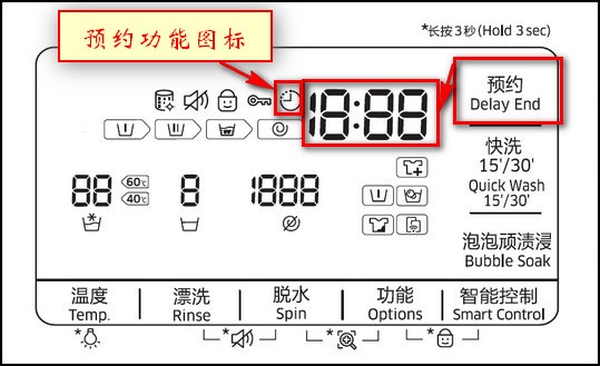 预约功能用于设置当前程序的结束时间,根据您的设置,洗涤程序开始时间将由机器内部逻辑来确定。该功能通常可用来在下班回家的时候正好完成洗衣。